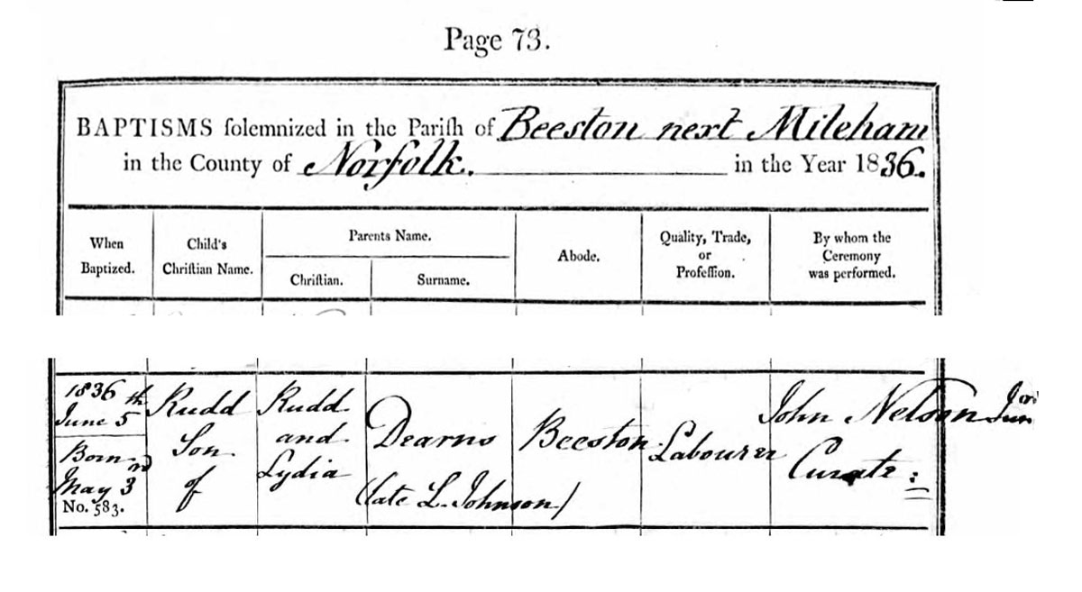 [PB: In 1841, Rudd Dearnes [father], aged 25-29, can be found in the household of Thomas Claxton and his family, in Wendling, Norfolk.