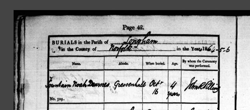 [PB: Fountain Noah Dearns died in Gressenhall at the age of 4 years in 1864 and was buried in Longham, Norfolk on the 16th October 1864. It may be significant that Gressenhall is close to East Dereham, where his mother, Lydia was born. Gressenhall also had a large workhouse, now a museum). Is it possible FND was in the workhouse, with one or both of his parents? I have not found any other children born to the couple.]