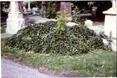 His tomb (and that of his wife, who was buried next to him) are now [1983] completely overgrown with ivy to a matted thickness of 6-8 inches and only enough was disturbed to verify who was buried there. The memorials themselves (of pink granite) are however still in almost perfect condition underneath their covering. [Photo by EJB, probably taken 1983.]