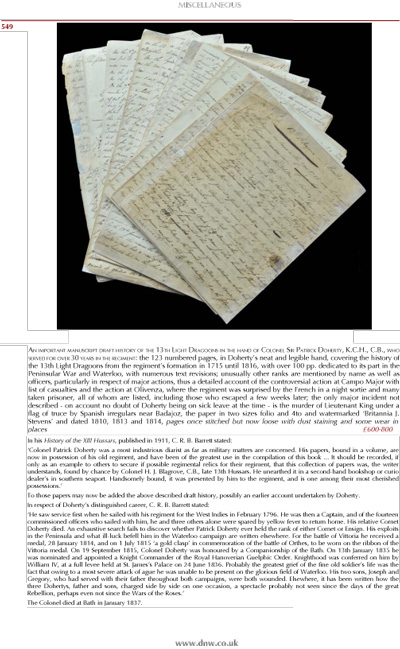 The 123 numbered pages, in Doherty's neat and legible hand, covering the history of the 13th Light Dragoons from the regiment's formation in 1715 until 1816, with over 100 pp. dedicated to its part in the Peninsular War and Waterloo, with numerous text revisions; unusually other ranks are mentioned by name as well as officers, particularly in respect of major actions, thus a detailed account of the controversial action at Campo Major with list of casualties and the action at Olivenza, where the regiment was surprised by the French in a night sortie and many taken prisoner, all of whom are listed, including those who escaped a few weeks later; the only major incident not described — on account no doubt of Doherty being on sick leave at the time — is the murder of Lieutenant King under a flag of truce by Spanish irregulars near Badajoz, the paper in two sizes folio and 4to and watermarked 'Britannia J. Stevens' and dated 1810, 1813 and 1814, pages once stitched but now loose with dust staining and some wear in places.
