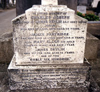 "Also of James Devlin, who died 3rd of February 1892, aged 58 years. 'One of the Noble Six Hundred.' Served with the 4th Queen's Own Light Dragoons in the Crimea and was severely wounded in the ever memorable Charge of the Light Brigade, 25th of October 1854."