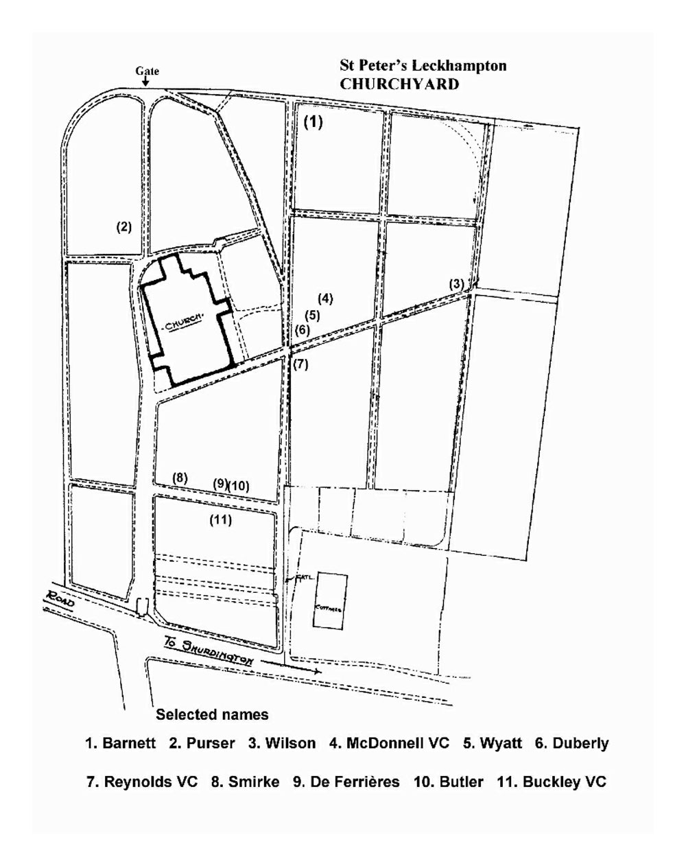 Map of churchyard: http://leckhamptonlhs.weebly.com/st-peters-burial-registers-1914-39.html