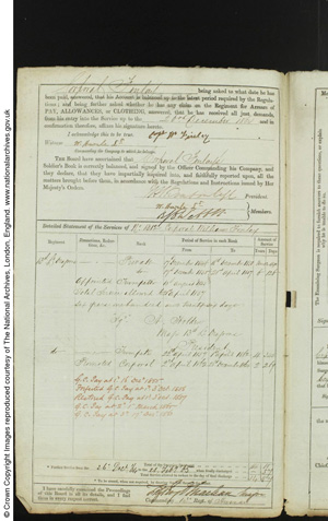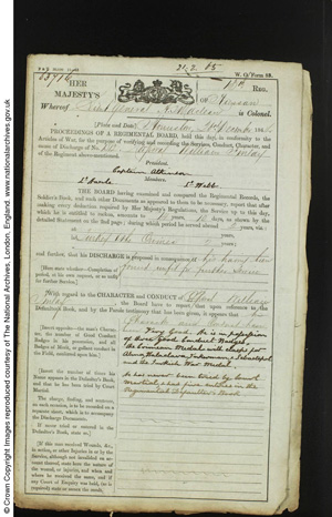 Character and conduct: "very good". In possession of 3 Good Conduct badges. Five times entered in the Regimental Defaulter's book. Never tried by Court Martial.
