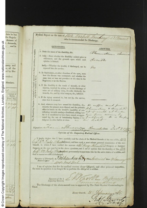 "Unfit for further service. — Has chronic rheumatism. Suffers much also from bronchitis, but it would not hinder him from earning a livelihood.