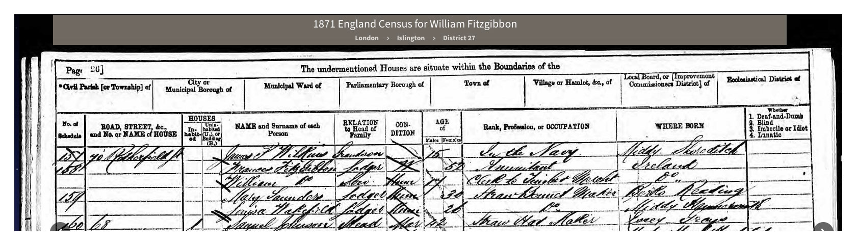 In the 1871 Census she was described as a lodger, an "Annuitant", living with her son, William, 17, a "Clerk to Timber Merchant". Both were born in "Ireland".