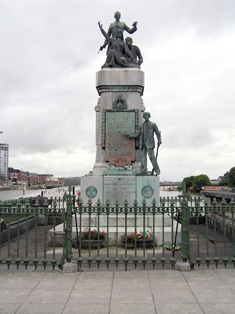 Formerly the memorial to Viscount John Charles Henry FitzGibbon, killed in the Battle of Balaclava. He stood in uniform on the stone plinth decorated with the names of those who fell in the Crimean War. Erected in 1857, FitzGibbon's statue was cast by the sculptor Patrick MacDowell (1799-1870). Originally intended for The Crescent, but with political and religious sentiments running high, the site was changed to Sarsfield Bridge. The site at The Crescent was given over, instead, to a monument for Daniel O'Connell, erected 1857. It was blown up on 9th June 1930, leaving only the podium intact. The plinth remained unused for many years until the erection of the the current memorial by sculptor Albert Power. One of the original stone plaques was overlain by a bronze plaque which records in Irish the names and events of the 1916 Rising. Another plaque reads: 'This memorial was erected by means of voluntary public subscriptions in memory of the Limerick men and their comrades who died for ... during the Easter Rising of 1916'. It is suggested that the Mother Ireland figure is based on local woman Kathleen Daly, was married to Tom Clarke. An interesting example of an imperial memorial remade as a monument to those who fought against the empire.
