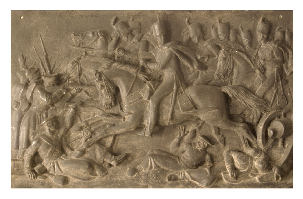 [PB: Note how JF is portrayed at the guns in front of the Charge, with his sabre pointing forward, turning back to urge his men forward. Leaving aside how wise a thing it is to be doing at this time, or whether at all necessary, it perhaps represents a riposte to the accusations that the young Fitzgibbon was not a leader in the Charge, and therefore did not deserve to be commemorated with a public statue (see above). Incidentally, the hats, and perhaps other details, look wrong — 11th Hussars? CHECK.