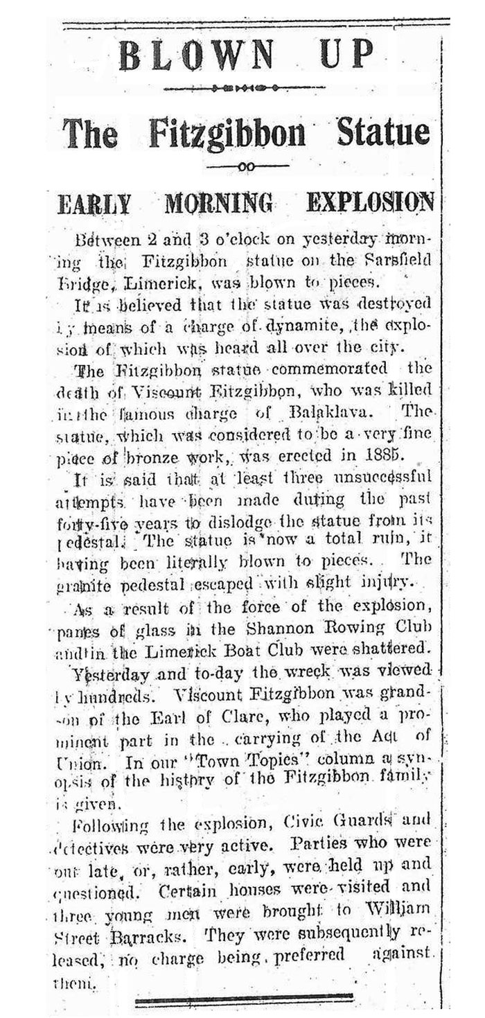 — "BLOWN UP: the Fitzgibbon statue: early morning explosion", Limerick Leader, 11th June 1930.