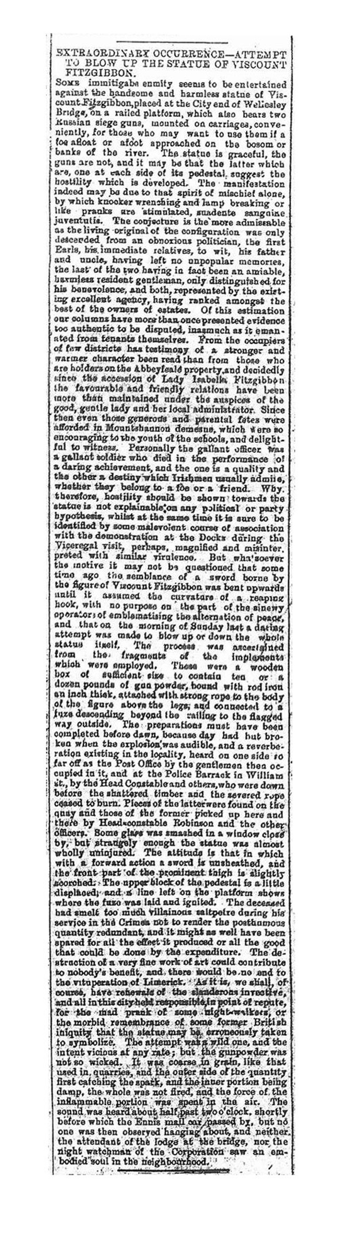 — Extraordinary occurrence — attempt to blow up the statue of Viscount Fitzgibbon, Munster News, 4th June 1873
