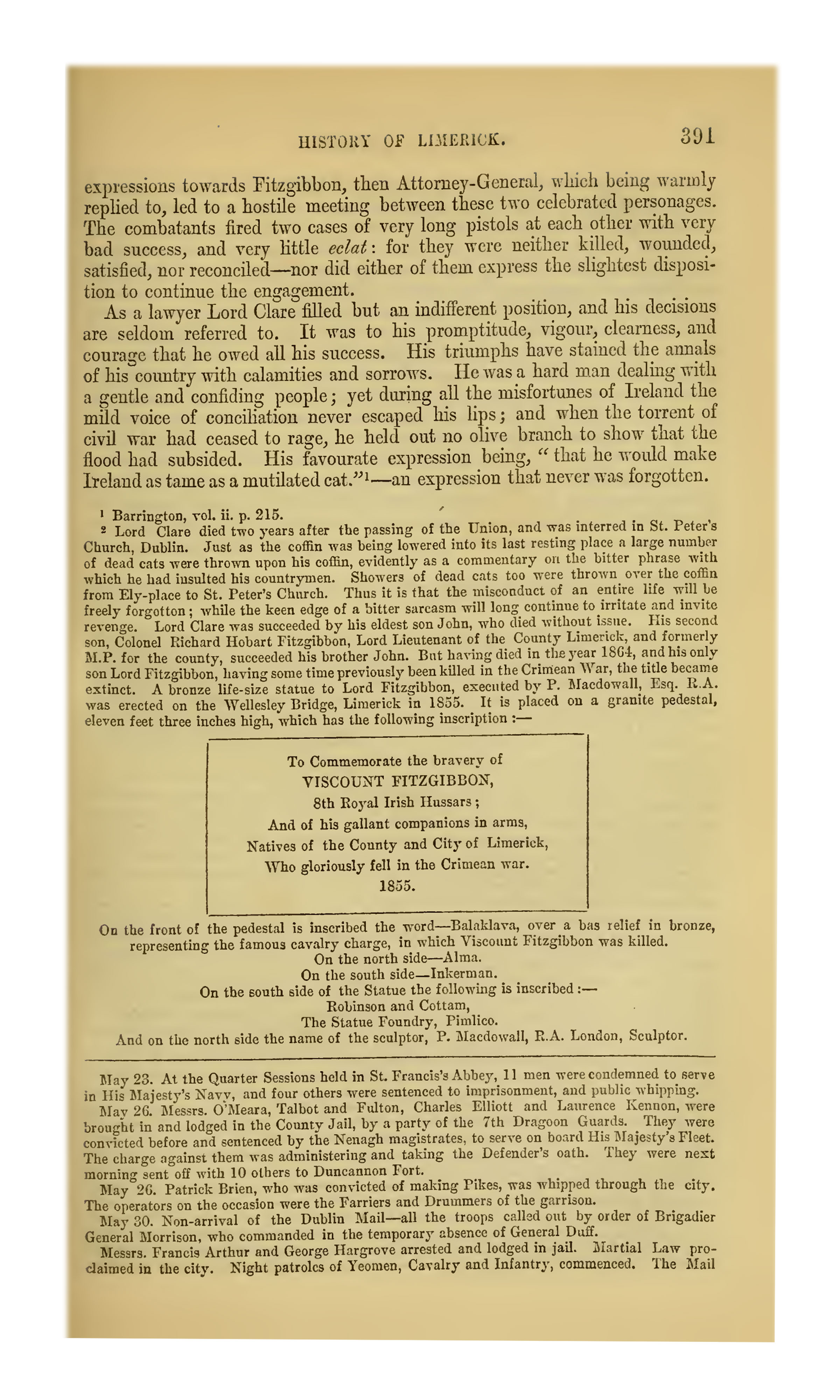 And here we are now assembled to answer such an appeal, by taking the necessary steps for erecting within our city some testimonial worthy of the memory of Lord Fitzgibbon and his brave companions in arms, natives of the county and city of Limerick, who shared in the glories of the Crimean war (cheers)."