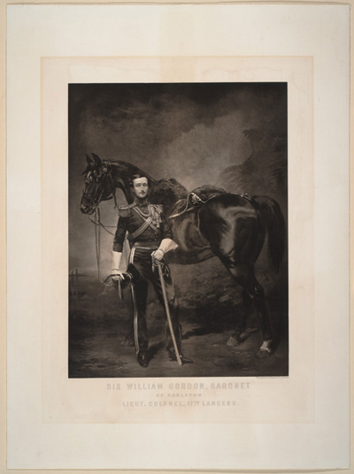 Note: Lt Colonel Sir William Gordon Bt, born October 1830 and educated at Cheltenham College, he entered the 17th Lancers in 1850 as Cornet. He was promoted Lieutenant in 1851 and Charged with the Light Brigade at Balaklava during which occasion he received 5 sabre wounds to the head. The skill of his surgeon in reconstructing part of his skull, and who described his patient as 'with his head off', is borne out by the fact that he was able to continue his military career seeing service in the Indian Mutiny campaign. Retired from military life in 1864, he died in 1906.