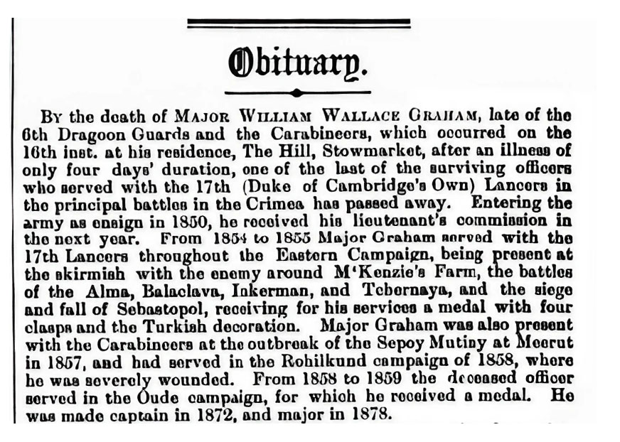 Major Graham was a hero of Balaclava. He was with the Light Brigade in the Charge of the Six Hundred and rode "into the jaws of death. He was a well-liked person who did several things of note for other people and was active in public life."