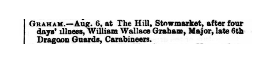 "Major Graham of Stowmarket had an attack of apoplexy which rendered him unconscious. His medical attendant (Dr. Roberts) could not save him and he passed away soon after 5 a.m. on Friday. His death was sudden. His body was taken from Stowmarket Station to Liverpool Street Station by train and thence to St. Mary's Church at Plaistow, and buried there on Wednesday. The service was conducted by the Revd. A.T. Mitton.