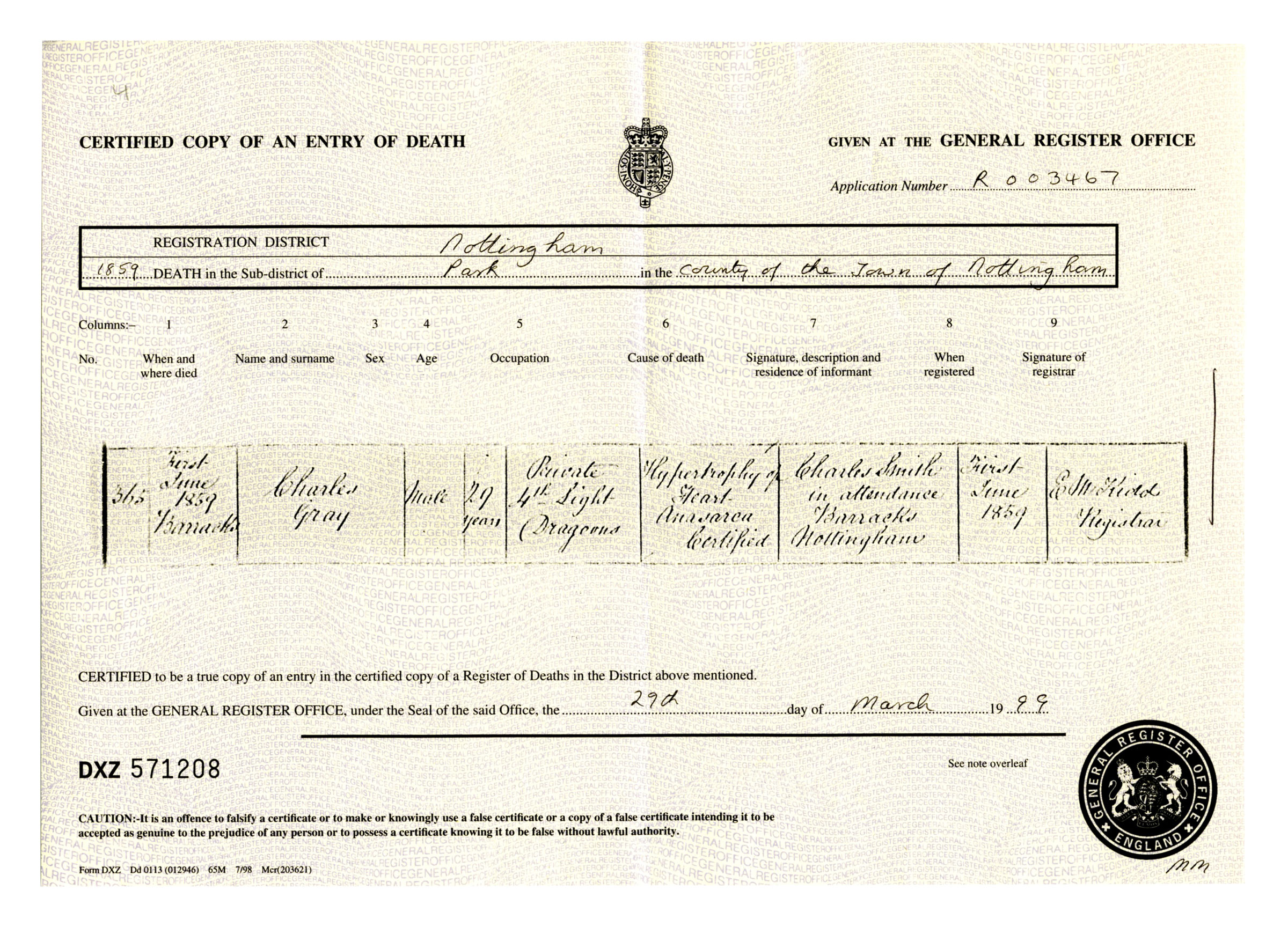 Charles Gray's death certificate shows that he died at the Barracks, Nottingham, a Private in the 4th Light Dragoons, on the 1st of June 1859 from "Hypertrophy of the Heart", aged 29 years. A Charles Smith, of the same address, was in attendance at his death.