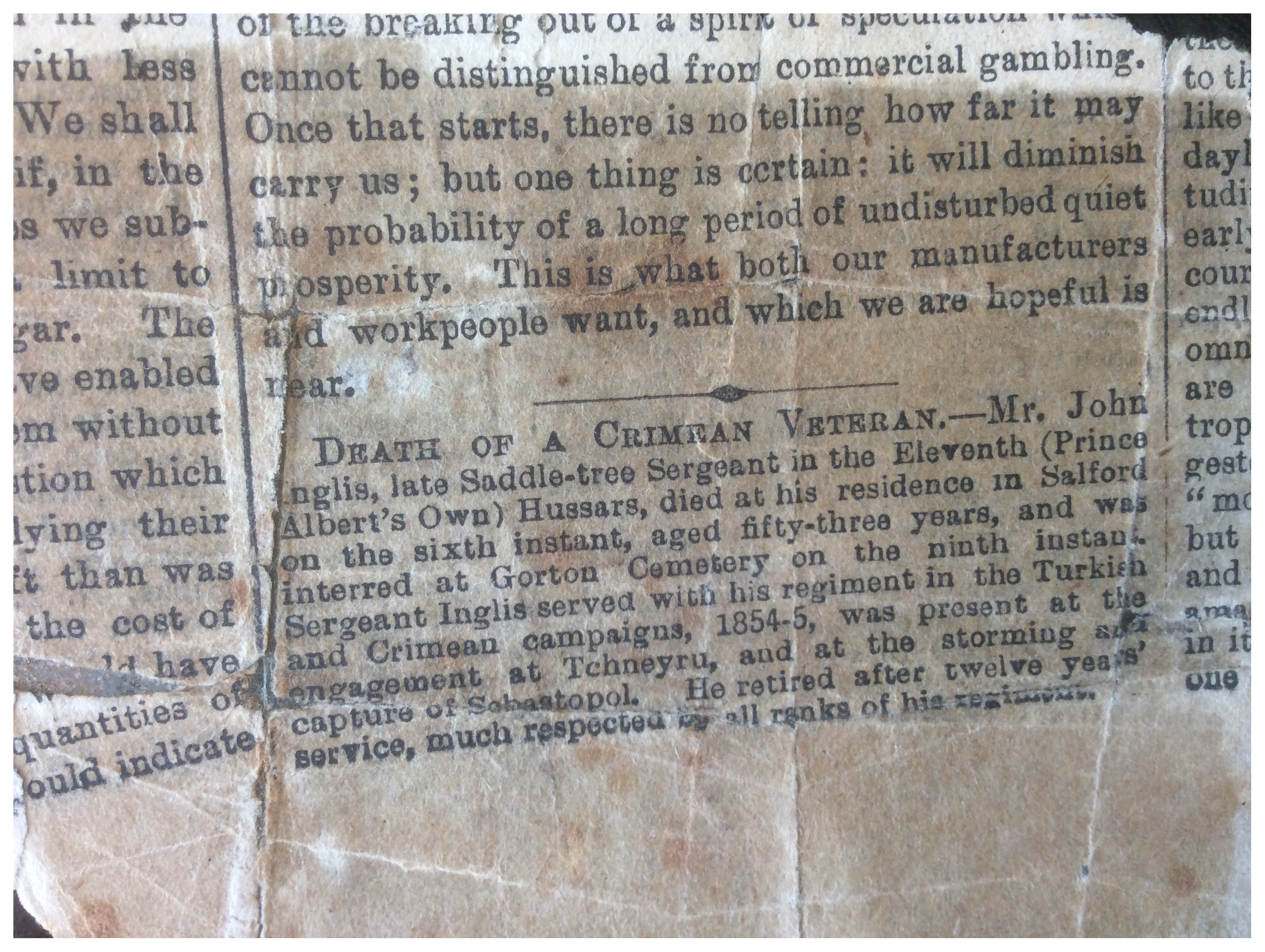[PB: In March 2016, we were delighted to be contacted by John Inglis's great-granddaughter, Pat Ford (nee Inglis), who has a number of his possessions, including his original discharge documents (parchment certificate) and Cavalry regulations book. She also has a photograph of him in uniform and a photograph of his grave. She said that John was in a home after the death of his parents, and his brother was in the Bluecoates School [sic? in York?]. Both travelled from York and were in lodgings together (see the 1851 Census).]