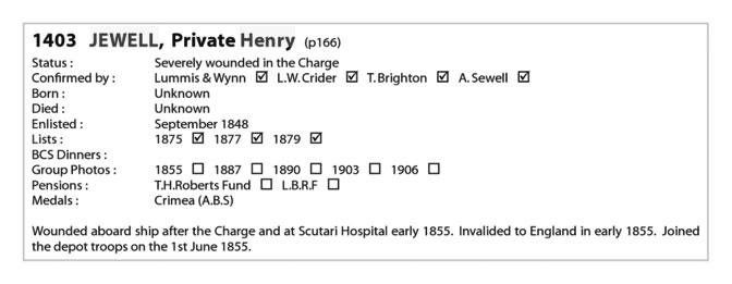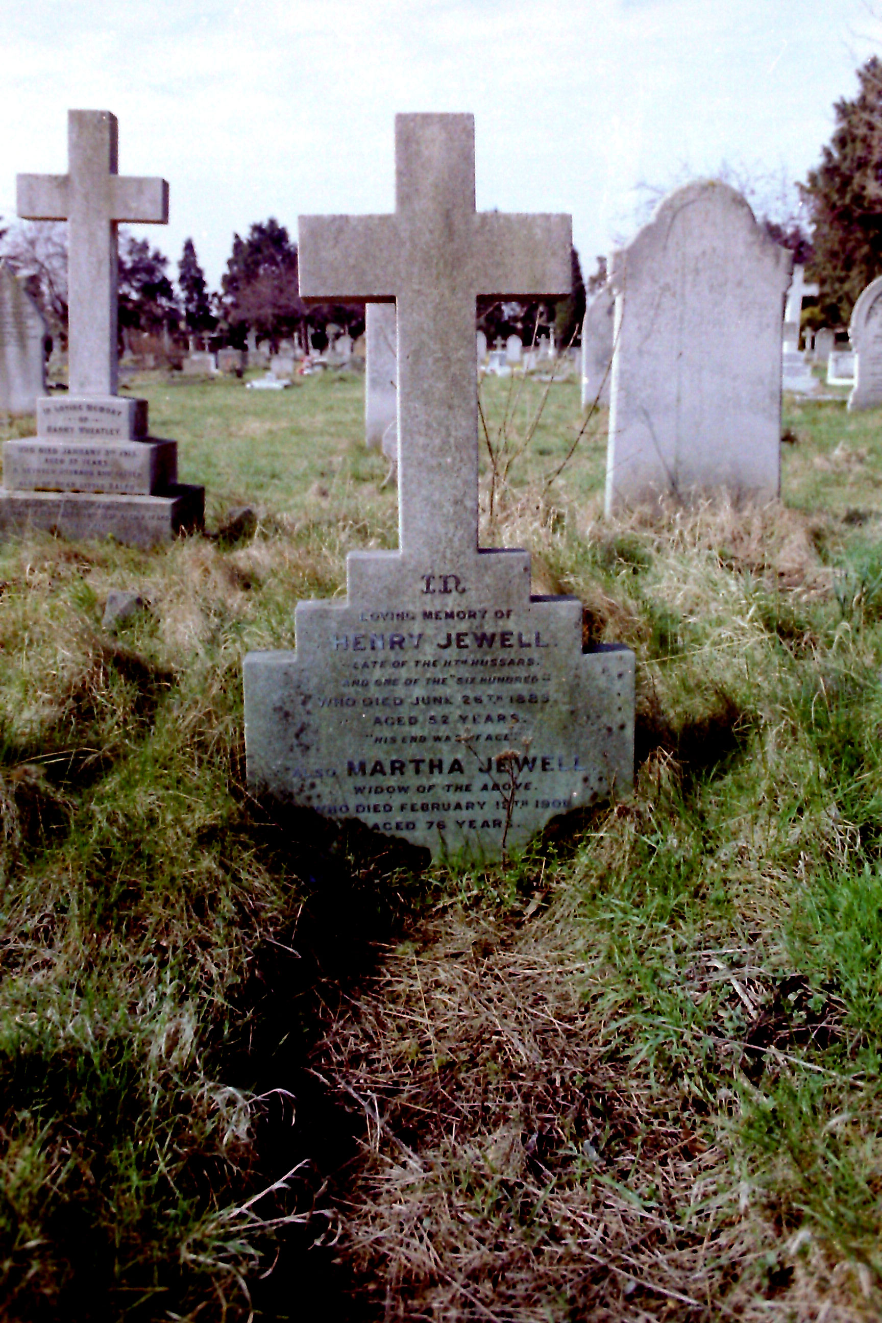 "In loving memory of Henry Jewell, late of the 11th Hussars and 'One of the Six Hundred', who died June 26th 1883, aged 52 years. 'His end was peace.'