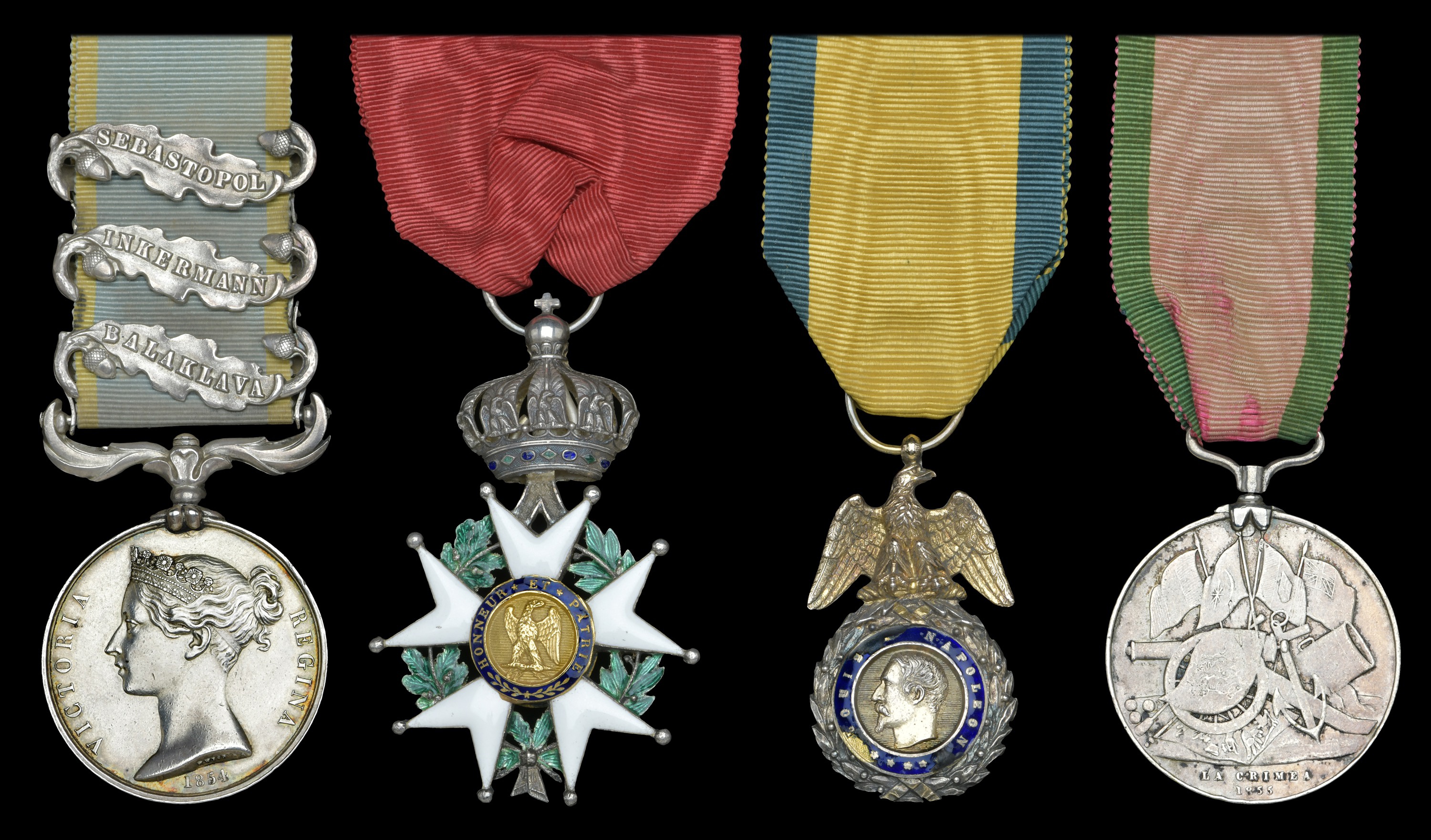 Crimea 1854-56, 3 clasps, Balaklava, Inkermann, Sebastopol, lugs removed from top clasp (Regt. Serjt. Major, Thomas George Johnson. 13th. Light Dragoons) Regimentally impressed naming in serif capitals; France, Second Empire, Legion of Honour, Chevalier's breast badge, silver, gold appliqué, and enamel, France, Second Empire, Medaille Militaire, eagle suspension, silver, silver-gilt, and enamel, blue enamel damage and traces of restoration to bands around central medallions; Turkish Crimea, Sardinian issue (T G Johnson 13th Light Dragoons) Regimentally impressed naming in serif capitals, with contemporary silver swivel suspension, all with plain top silver riband bars, and housed in a fitted gilt frame, lacking glazing, the gilt mount engraved 'Major T. G. Johnson, Late Captain, 13th Hussars', light contact marks, generally very fine or better (4) £8000-12000