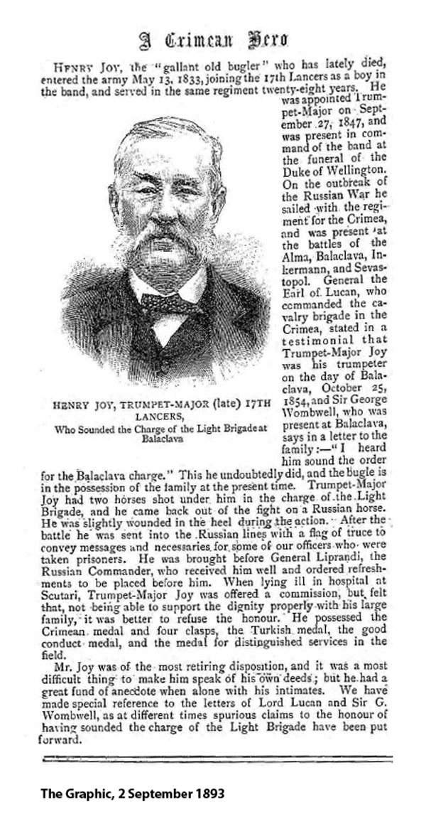 "17th Lancers — In the grave-yard of Chiswick Parish Church on the 19th of August were conveyed to their last resting-place the remains of Henry Joy. Joy, as the Staff Trumpeter to Lord Raglan [sic] sounded the advance for the famous Balaclava Charge. The coffin, which was of polished oak, bore the inscription, "Henry Joy. Died Thursday, August 17th 1893, in his 75th year." The Revd. N.W.T. Dale, of Chiswick, officiated. The mourners included the two sons and four daughters of the deceased."