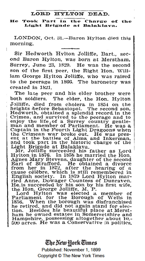 1. a b Obituary of Baron Hylton in The Times, Wednesday, 1 Nov 1899; pg. 7; Issue 35975; col E. The death was also reported in New York Times, 1 November 1899, Wednesday: "LORD HYLTON DEAD.; He Took Part in the Charge of the Light Brigade at Balaklava.".