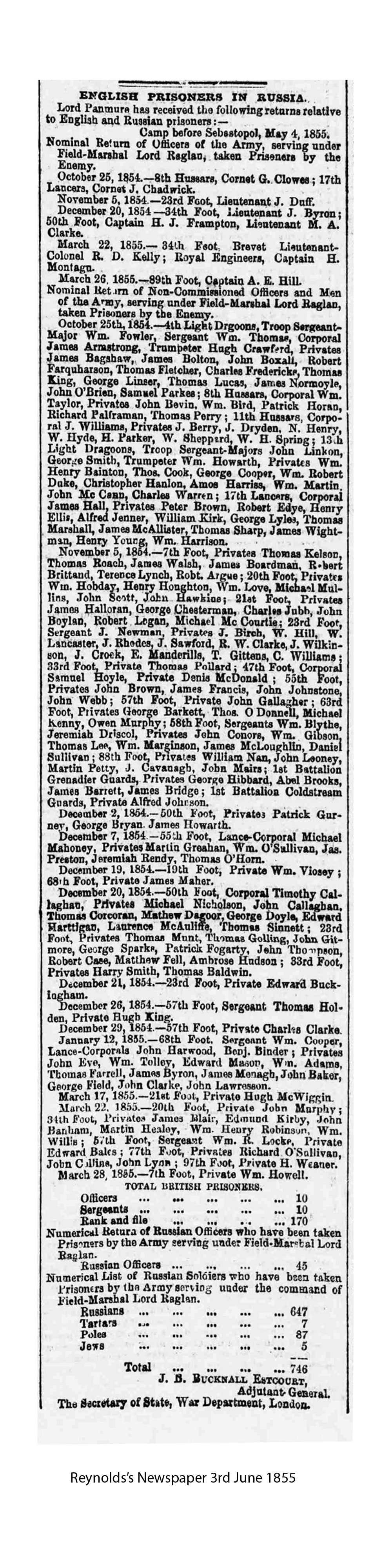 Rejoined the Regiment from Russian captivity on the 22nd of October 1855.