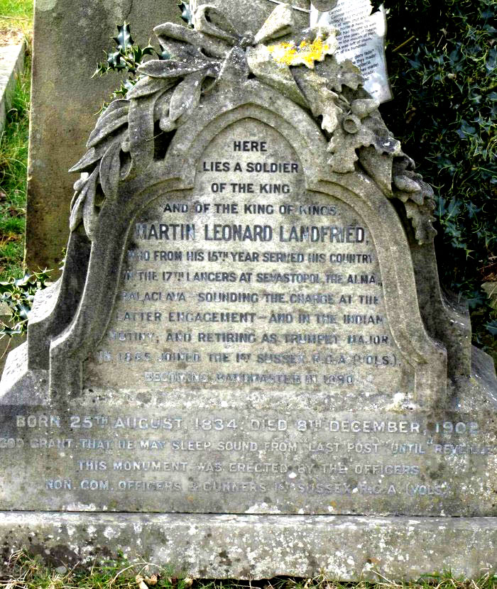 t was later learnt from his obituary report that he was also awarded the Volunteer Long Service medal and a Special Army order dated the 17th of January 1895 lists the Officers, N.C.O's and Men of the 1st Sussex Volunteer Artillery (Eastern Division R.A.) and other units of the Army who were awarded it. He is shown as No. 1071 Serjt-Trumpeter L. (sic) Lanfried. (There is a copy of this roll in the 17th Lancer file.) While doubtless not his original medal, there is now an un-named medal of the type with the group.]