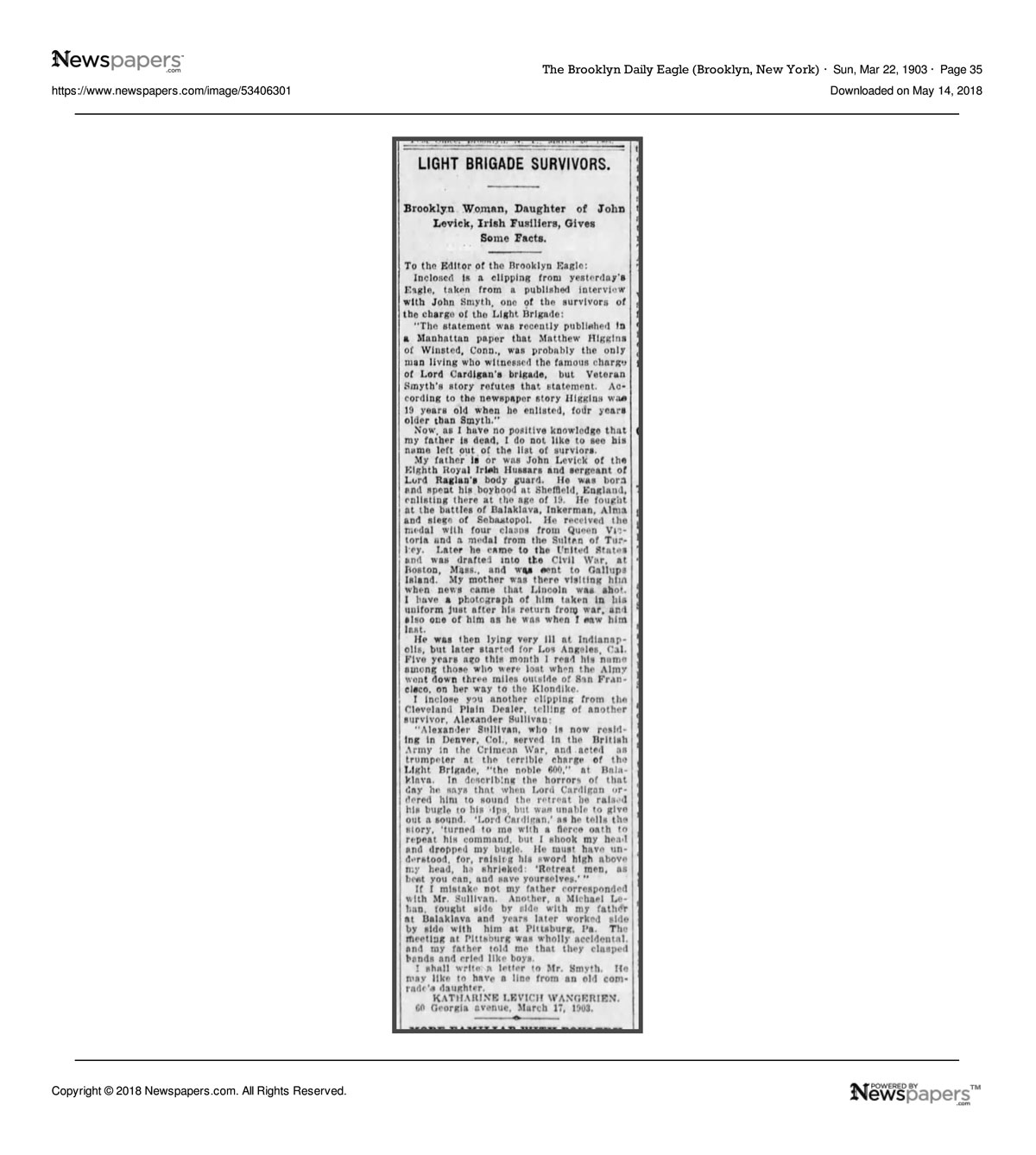 "In last Saturday's issue [exact date?] you refer to an agent of the British Government searching for the whereabouts of John Levick, whom you say served all through the Crimean War. With your permission I wish to give you and your readers a little insight into the doings of the aforesaid British Government respecting the noble 600. John Levick was well known to me. He was a sergeant for some time in the 8th Hussars. I am rather surprised to hear that the British Government are so anxious to make "some substantial return to any survivors of that famous charge." If they intend to do anything, they had better do it quickly, for up to the present they have shown to such survivors nothing but studied neglect...