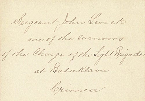 The sergeant pens his name on this 2¼x3¼ card Signature: "Sergeant John Levick/ one the survivors/ of the Charge of the Light Brigade/ at Balaklava/ Crimea", in black ink, 2¼x3¼. The Charge of the Light Brigade was a British military offensive mounted during the Crimean War. The charge took place during the Battle of Balaclave on October 25, 1854, and was led by Lord Cardigan. Notable for its reckless nature, the charge illustrated the bravery of the British soldiers, while casting into doubt the competency of their commanders. The British suffered a high number of casualties with 118 men killed, 127 wounded and about 60 taken prisoner. Ultimately, the assault proved to be foolhardy as the British made no discernible gains. Signer merits further research. Lightly toned. Otherwise, fine condition. — Please contact us if you have any questions or require additional information. HFSID 27885