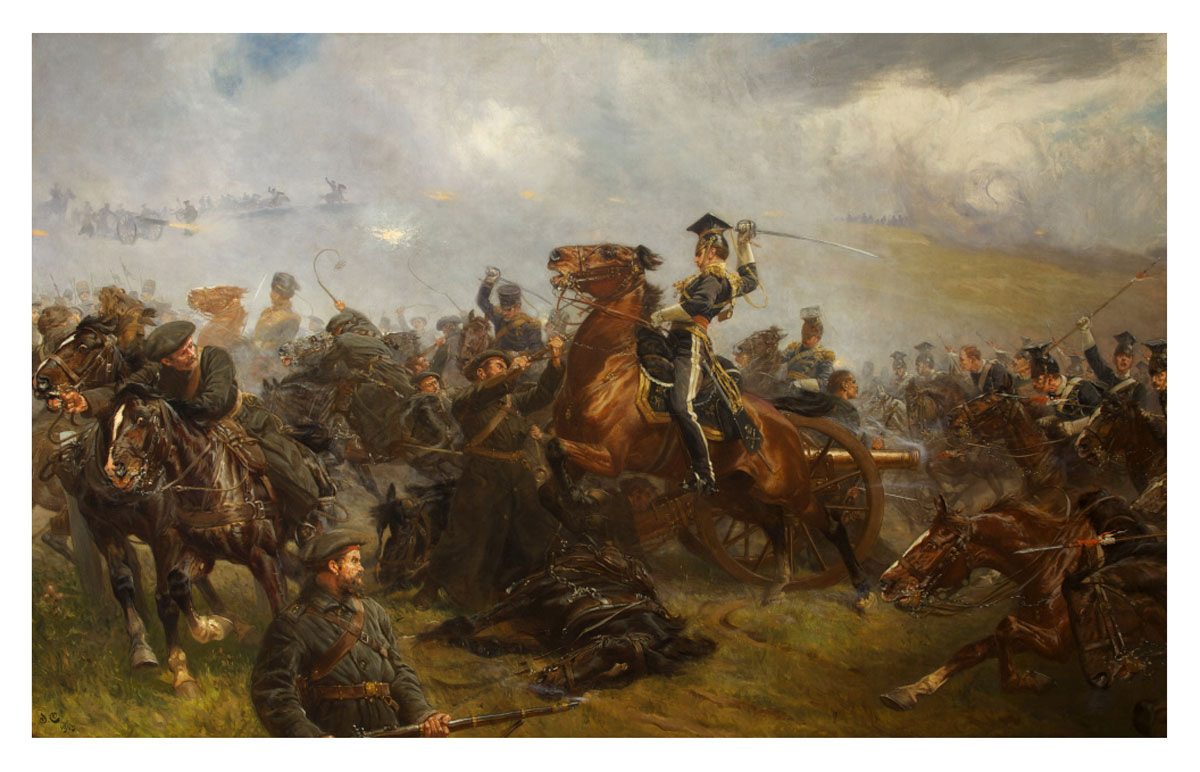 Summary: Oil painting on canvas, The Charge of the Light Brigade, the Battle of Balaclava, 25th October 1854 with Godfrey Charles Morgan, 1st Viscount Tredegar (1831 — 1913) sitting astride his Rearing Horse, 'Sir Briggs' by John Charlton (Bamburgh 1849 — London 1917), signed lower left corner, J C 1905. The 1st Viscount, as Captain of the 17th Lancers, astride his horse with his sabre raised. Other officers depicted are Lieutenant-General James Thomas Brudenell, 7th Earl of Cardigan, MP (1797-1868) and Lord George Paget (1818-1880). 'Sir Briggs' is buried in the grounds of Tredegar.