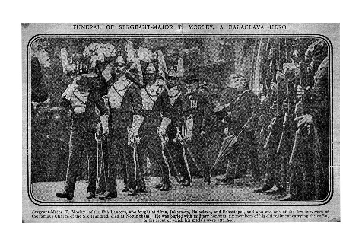 "Sergeant-Major T. Morley, of the 17th Lancers, who fought at Alma, Balaclava, and Sebastopol, and who was one of the few survivors of the famous Charge of the Six Hundred, died at Nottingham. He was buried with military honours, six members of his old regiment carrying the coffin, to the front of which his medals were attached."