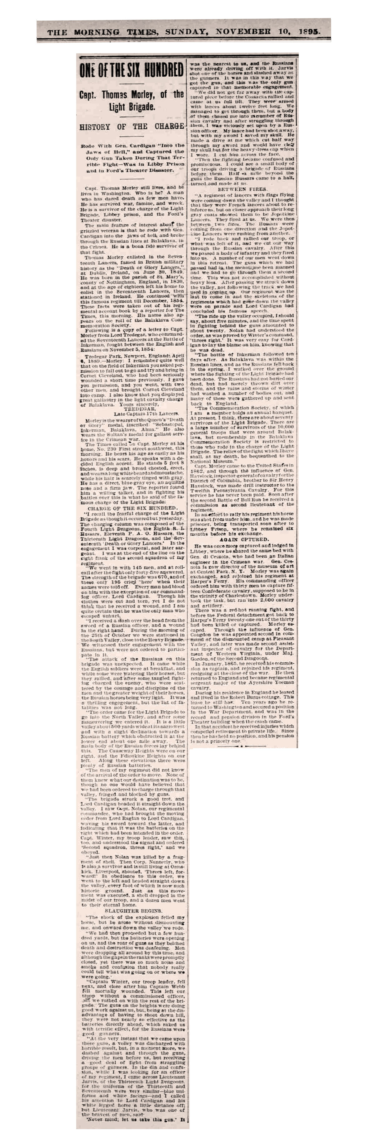 In a "Scrapbook" formerly belonging to 1177, James W. Wightman, 17th Lancers, was found part of a pamphlet which Morley published in the United States sometime around 1889/90, and also a printed copy of a letter which Wightman had written to Morley referring to his (and Morley's) part in the Charge. Morley, then living at 1116, 6th Street, Washington, D.C., said: