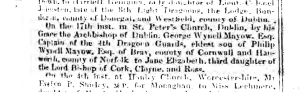 The deceased possessed large estates in Norfolk and Cumberland [?], and the daughter of the Bishop of Cork is united to one of the sons belonging to the church [PB: surely not — it was GWM]. Mrs. Mayow died about five months since. several occasions