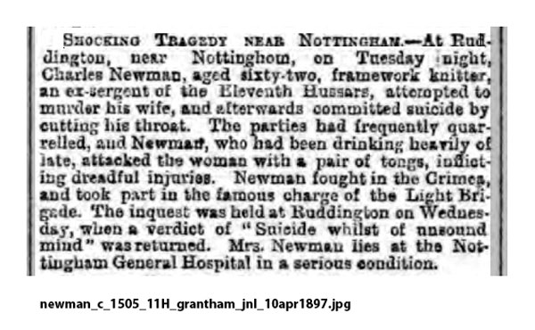 At Ruddington, near Nottinghom, on Tuesday night, Charles Newman, aged sixty-two, framework knitter, ex-sergent the Eleventh Hussars, attempted to murder his wife, and afterwards committed suicide by cutting his throat. The parties had frequently quarrelled, and Newman, who had been drinking heavily of late, attacked the woman with pair of tongs, inflicting dreadful injuries. Newman fought in the Crimea, and took part in the famous charge of the Light Brigade. The inquest was held Ruddington on on Wednesday, when a verdict of "Suicide whilst of unsound mind" was returned. Mrs. Newman lies at the Nottingham General Hospital in a serious condition. (Grantham Journal, 10th April 1897)