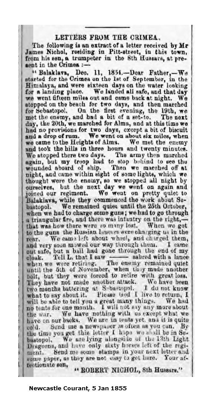 The following is an extract of a letter received by Mr James Nichol, residing in Pitt-street, in this town [Newcastle], from his son, a trumpeter in the 8th Hussars, at present in the Crimea: