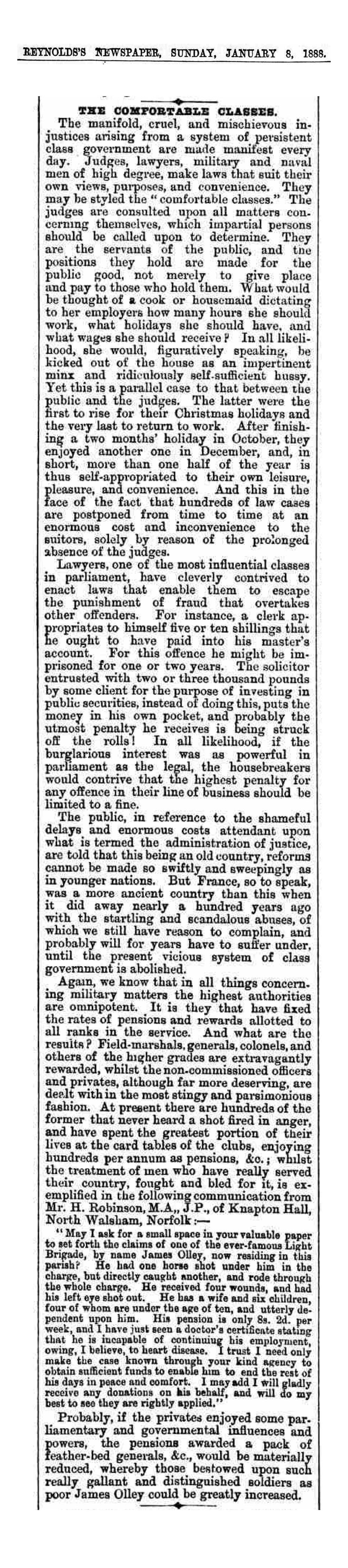 Probably, if the privates enjoyed some parliamentary and governmental influences and powers, the pensions awarded a pack of feather-bed generals, &c., would be materially reduced, whereby those bestowed upon such really gallant and distinguished soldiers as poor James Olley could be greatly increased.[Source: "The Comfortable Classes", Reynold's Newspaper, 8 January 1888. The article can be viewed here. A transcript is available here.]