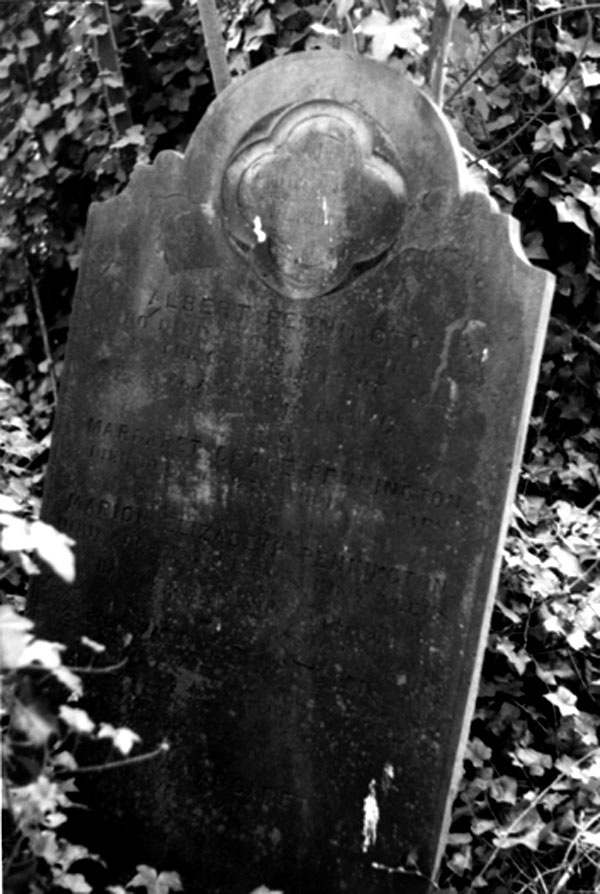 The number of the people recorded on the stone would seem to exceed the normal allowable number of interments, and the later interments may have taken place close by. Some of the dates and names do not agree with those originally given by the cemetery authority. It is also very difficult to say just who Margaret Grace and Elizabeth Marie were, but from their ages were probably his daughters, Albert and Margaret Pennington his father and mother, Frances Emma, his wife, and the Revd. Walter and E..... Pennington, his brothers.