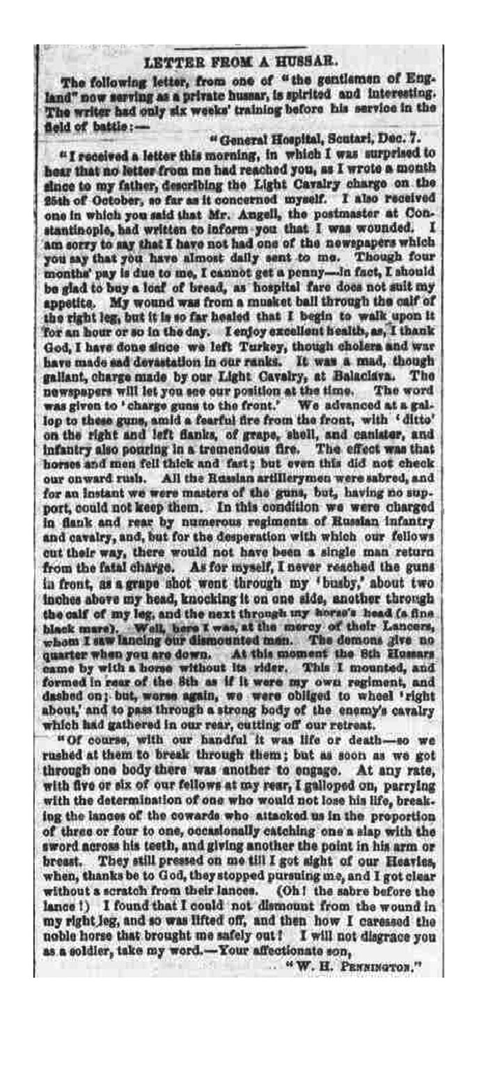 "A private of the 11th Hussars, named William Pennington, when writing to his father, says... 'I was surprised to hear that no letter has reached you, as I wrote a month since, describing the Light Cavalry charge on the 25th October as far as it concerned myself. My wound was from a musket ball through the calf of my right leg, but so far has healed that I began to walk upon it for an hour or so in the day. It was a mad but gallant charge made by our Light Cavalry at Balaclava.