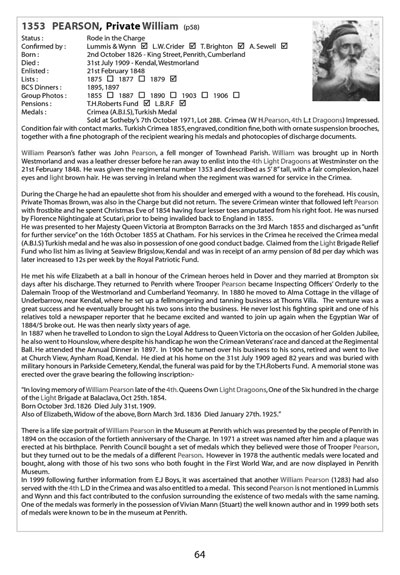 A news item in the Westmorland Gazette, 19th of March 1955, showed that a previous letter about him to the Editor had brought to light a photograph of William Pearson in civilian clothes and wearing his medals. The picture then belonged to a Miss Irvine, of Kendal, but had formerly belonged to Miss Irvine's mother, who died in 1978 aged 100. She had known Mr. Pearson well and often used to talk about him. Miss Irvine remembers her mother saying that the old veteran had lost several toes from frostbite during the campaign and she thinks he may have lived in New Road, Kendal, but she remembers little else about him. (There is a copy of this photograph in the 4th Hussar file.)