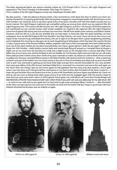 ... Several brave young men, natives of Penrith, have cheerfully borne their share in the dangers and hardships of the present war. There is poor Tom Bromley, whose graphic and pathetic letters must have struck every one who read them, and Lowther Stewart, too, and Harry Bromley, both of whom fell victims, not to Russian bayonets, but the pestilence; and last, not least, William Pearson, the Light Dragoon, who, after charging at the cannon's mouth, where the leaden shower rained death around him in the valley of Balaklava, has recently returned to England. What a pity he was not in Penrith on Tuesday night!