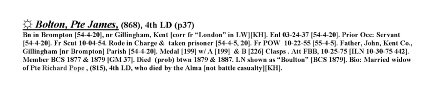 Laurence Crider, In Search... (2004) writes in his entry on 868, James Bolton 4LD that Pope: "died by the Alma [not battle casualty]", but says nothing in his entry on Pope himself [online edition — info. may have been superseded in later editions. And on what did he base his statement?]: