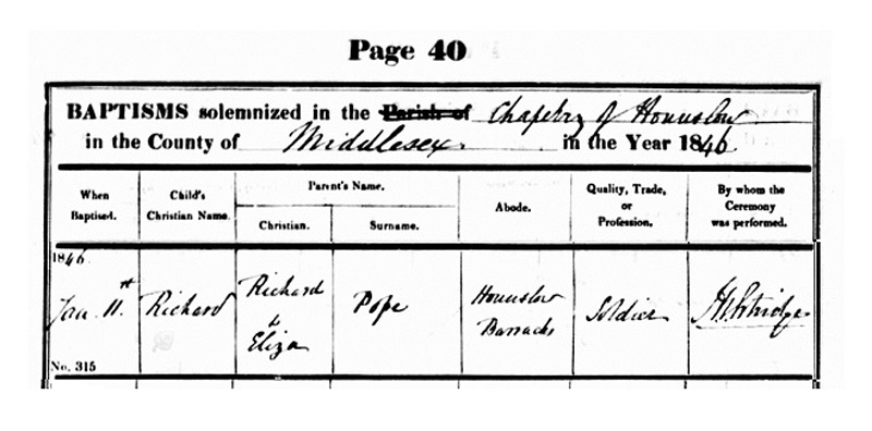 His son Richard entered the Royal Military Asylum on the 30th of December 1855, aged 7 years 4 months. His father was shown as "Dead" and his mother, Elizabeth, as "Still alive." He is later shown as being "Delivered over to his mother and step-father, still serving", on the 14th of December 1859.