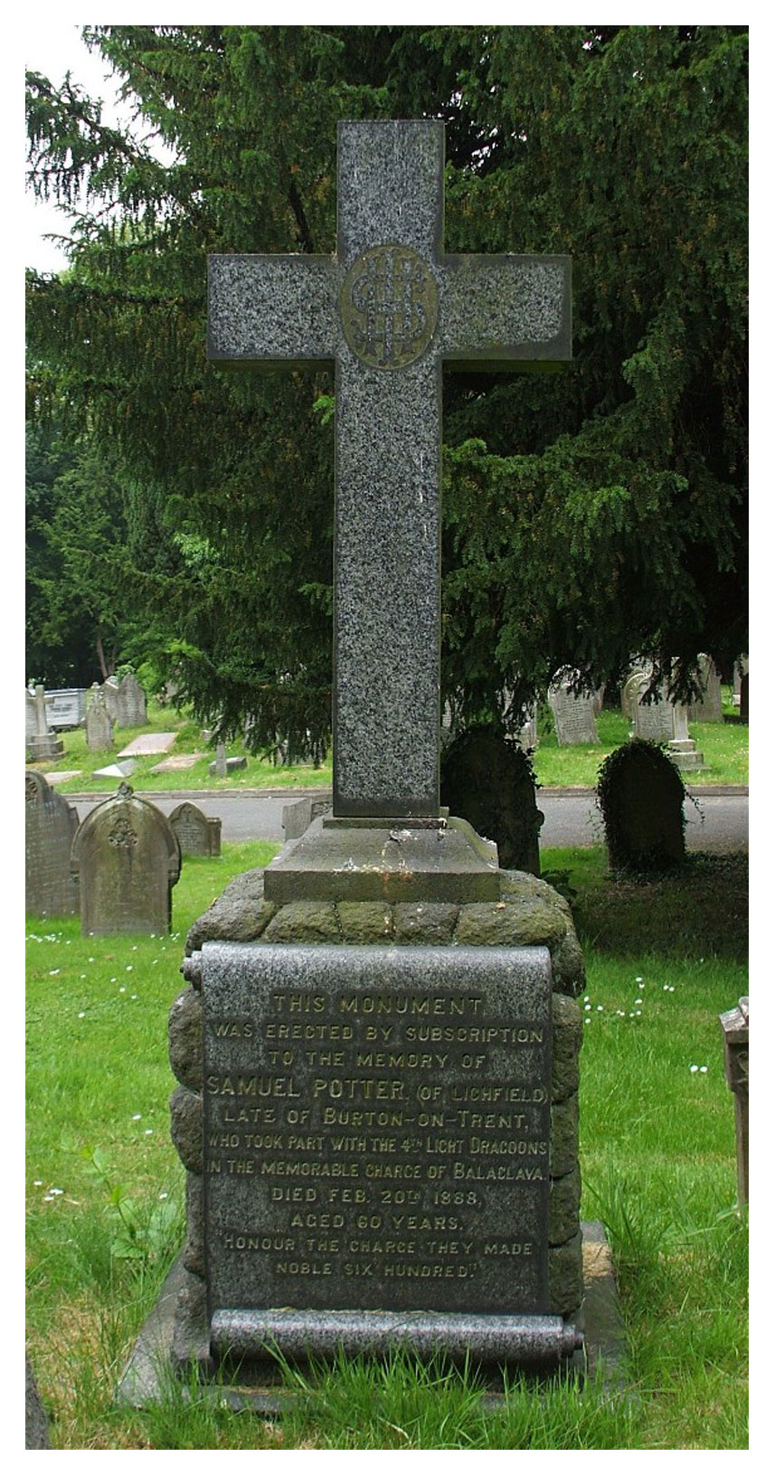 This monument was erected by subscription to the memory of Samuel Potter (of Lichfield) late of Burton-upon-Trent, who took part with the 4th Light Dragoons in the memorable charge at Balaclava. Died February 20th 1888, aged 60 years.