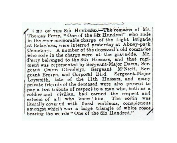 "On Wednesday, in the presence of a large number of comrades of the deceased, the remains of Mr. Thomas Perry, late of the 8th Hussars and one of "Six Hundred" who rode in the charge of the Light Brigade at Balaclava were interred in Abney Park Cemetery.