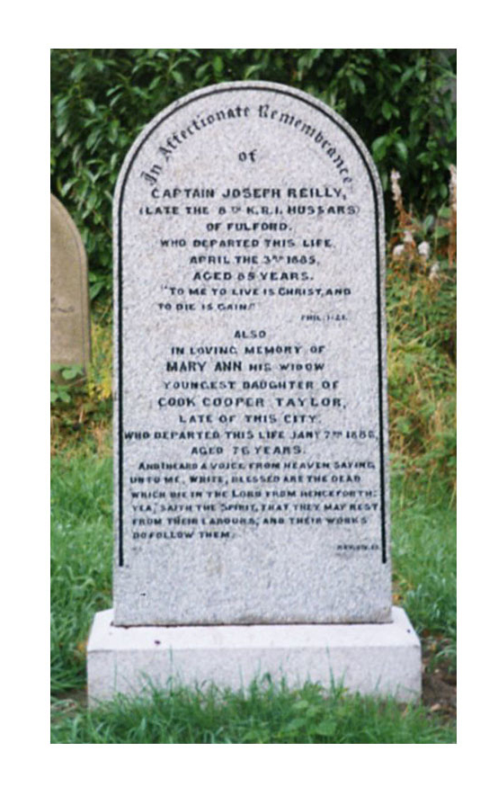 In affectionate remembrance / of / Captain Joseph Reilly / late the 8th K.R.I. Hussars / of Fulford / who departed this life / April 3rd 1885, / aged 85 years. / "To me to live is Christ, and / to die is gain" / Phil 1-21. Also / in loving memory of / Mary Ann, his widow / youngest daughter of / Cook [sic] Cooper Taylor / late of this City / who departed this life, Jan 7th 1886 / aged 75 years./ And I heard a voice from Heaven saying / unto me, write, Blessed are the dead / which die in the Lord from henceforth. / Yea, saith the Spirit that they may rest / from their labours and their works / do follow them. Rev. xiv. 1.