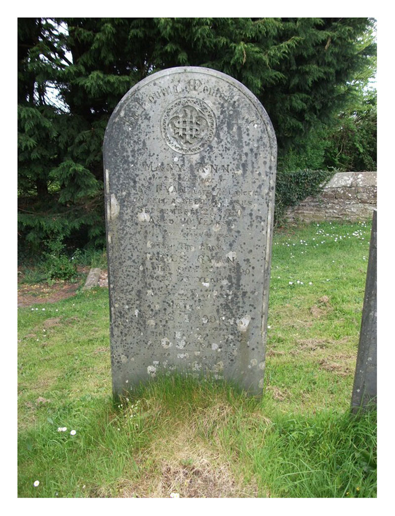From other known inscriptions on his gravestone, it would appear that he had married twice, his second wife being the Jane Ryan, aged 60, shown on the Census Return for 1881. The last inscription refers to her: "Also Jane, widow of the above James Ryan, who died April 29th 1894, aged 73 years."