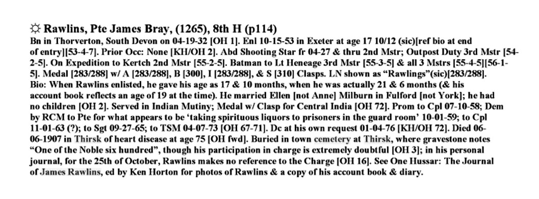 The old soldier, a resident of Thirsk, was ex-Troop Sergeant Major James Rawlins of the 8th Hussars. Rawlins had enlisted into the 8th Hussars at Topsham Barracks, Exeter, on the 15th of October 1853, at the age of 17 years and 10 months.