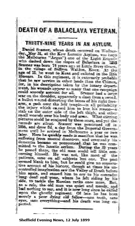 "Samuel Seamer [sic] whose death occurred on Wednesday last at the Kew Lunatic Asylum was one of the Light Brigade in 1853 [sic]. Samuel Seamer was born 74 years ago at Littlebury Green, in the village of Saffron Walden, Essex. At the age of 17 he went to Kent and enlisted into the 11th Hussars.