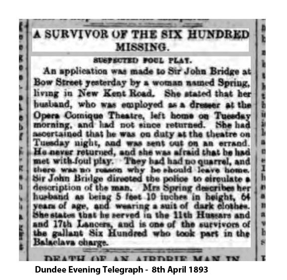 Sir John Bridge directed the police to circulate a description of the man. Mrs Spring describes her husband as being 5 feet 10 inches in height, 64 years of age, and wearing a suit of dark clothes. She states that he served in the 11th Hussars and 17th Lancers, and is one of the survivors of the gallant Six Hundred who took part in the Balaclava charge.