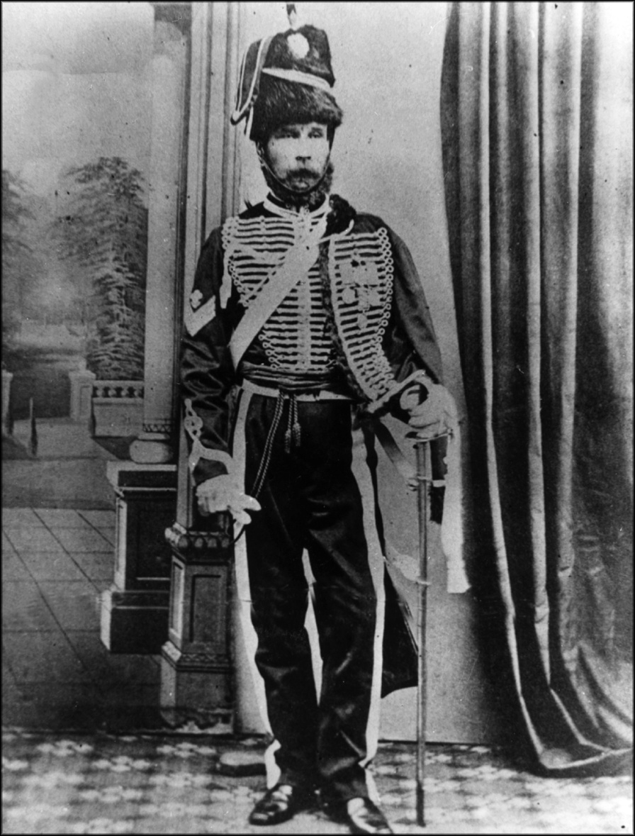 The uniform he is wearing in the photograph is now believed to be that of the 10th Hussars and not the 4th. This possibly disposes of the theory that this was taken soon after the Crimean War and he probably had this done at a later date, using the photographer's "props".