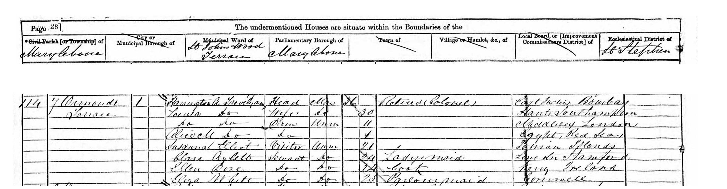 Harrington A. Trevelyan, Head, Married, 36, Retired Colonel, born Bombay. East Indies.