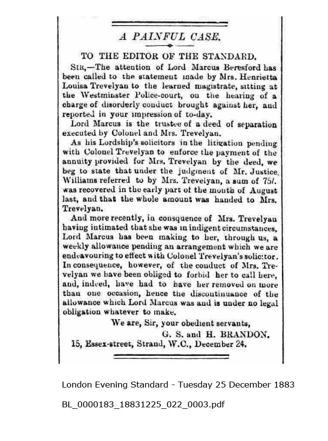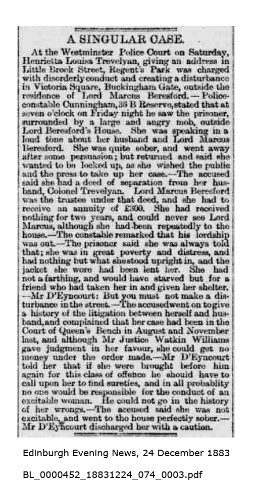 The earliest newspaper report I have come across is from August 1883. Having separated some years previously (probably before 1880), Trevelyan has promised to pay Henrietta £300 a year, to be given to her via Lord Marcus Beresford. Beresford is suing Trevelyan for failing to provide that money. Trevelyan is counter-claiming that he wants the original terms of the separation changed. Clearly Henrietta is demanding that Beresford should provide her with funds anyway, and retrieve them from Trevelyan. She becomes a nuisance, and things get worse.